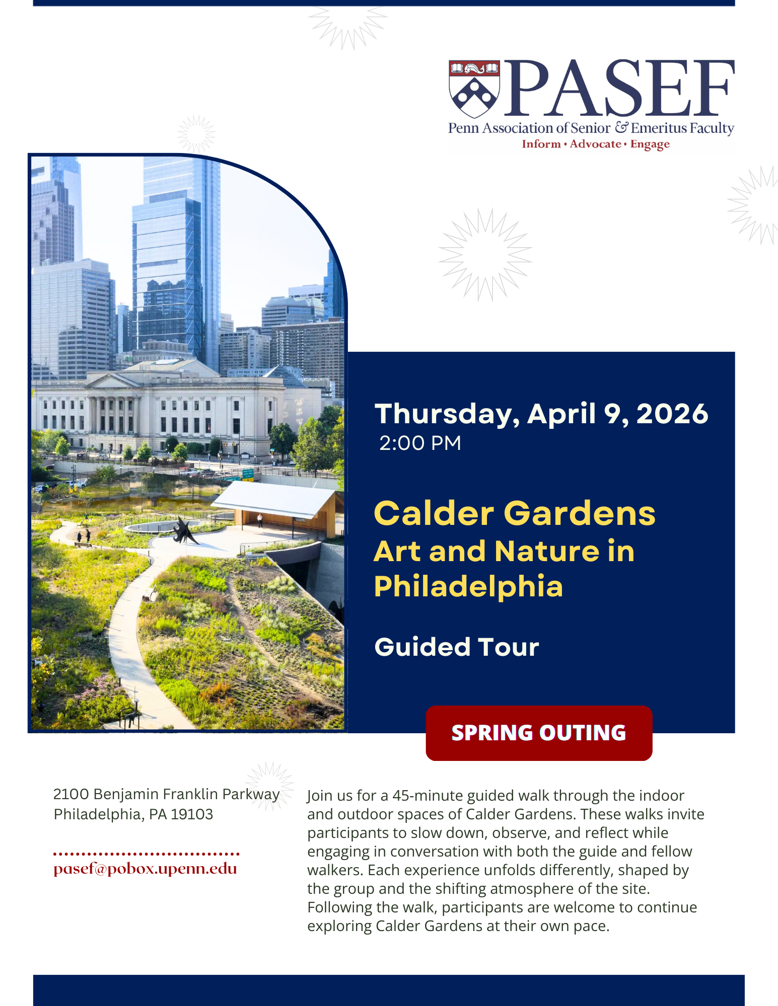 Join us for a 45‑minute guided walk through the indoor and outdoor spaces of Calder Gardens. These walks invite participants to slow down, observe, and reflect while engaging in conversation with both the guide and fellow walkers. Each experience unfolds differently, shaped by the group and the shifting atmosphere of the site. Following the walk, participants are welcome to continue exploring Calder Gardens at their own pace.
